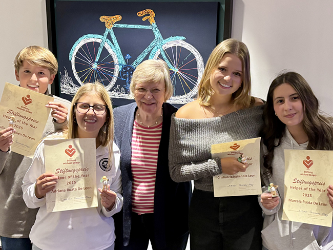 Bei all diesen Unterstützungsarbeiten und Projekten kann die Stiftung Michael Skopp auf die wertvolle und ehrenamtliche Unterstützung von lieben Freunden und guten Bekannten vor Ort zählen. Sogar die nächste Generation hilft eifrig und mit viel Enthusiasmus mit. Anlässlich vom kürzlichen Besuch von Rosi Skopp, der Vorsitzenden der Stiftung Michael Skopp, in Guatemala bei den verschiedenen betreuten Schulen, überreichte sie den jugendlichen Helfern als Dankeschön für ihren Einsatz eine Ehrenurkunde als «Ehrenamtliches des Jahres 2025». Julian, Adriana, Christina und Marcels bekamen dazu von der Vorsitzenden ein vorzeitiges Weihnachtsgeschenk in Form eines Engels, der sie bei ihrem Einsatz für die Kinder begleiten soll. Bereits warten 300 von den Jugendlichen liebevoll verpackte Geschenke, welche zu Weihnachten von ihnen an die betreuten Schulkinder überreicht werden, sodass auch sie sich auf Weihnachten freuen können.